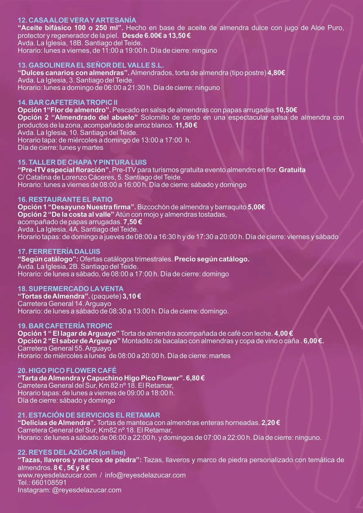 En la misma 10 establecimientos de restauración del casco de Santiago del Teide, Arguayo y El Retamar ofrecerán todo tipos de tapas, menús y desayunos para los visitantes y caminantes que realicen alguna de las rutas programadas. Además, otros 12 comercios ubicados en dichos lugares ofrecerán una amplia variedad de ofertas de productos relacionados con la floración del almendro.