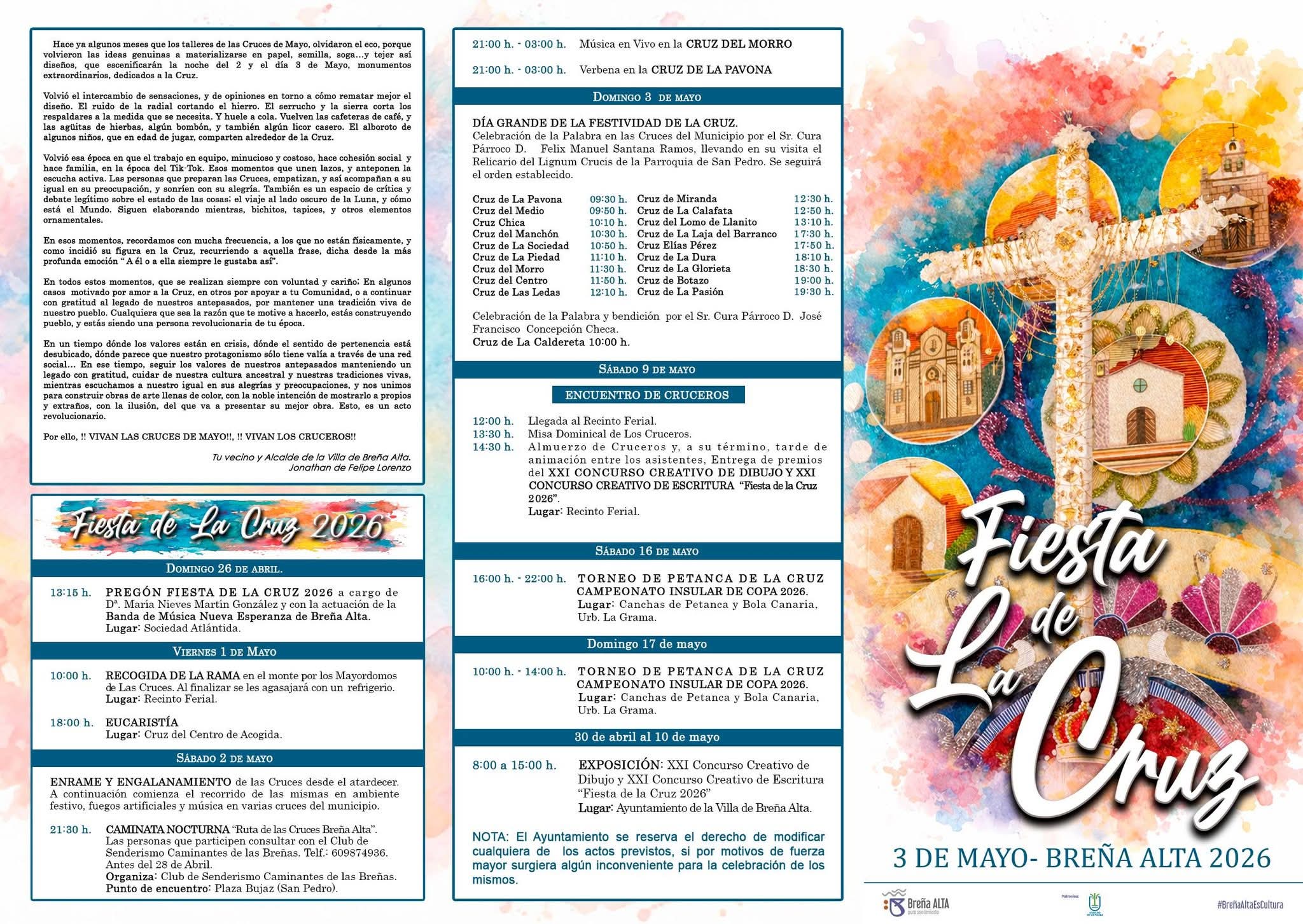 Breña Alta, 28 de abril de 2026. – Breña Alta se convierte, un año más, en un espacio de acogida, convivencia y tradición con motivo de la celebración de la Fiesta de la Cruz, una de las manifestaciones culturales y religiosas más arraigadas del municipio y que es vivida por sus vecinos con especial dedicación e ilusión.