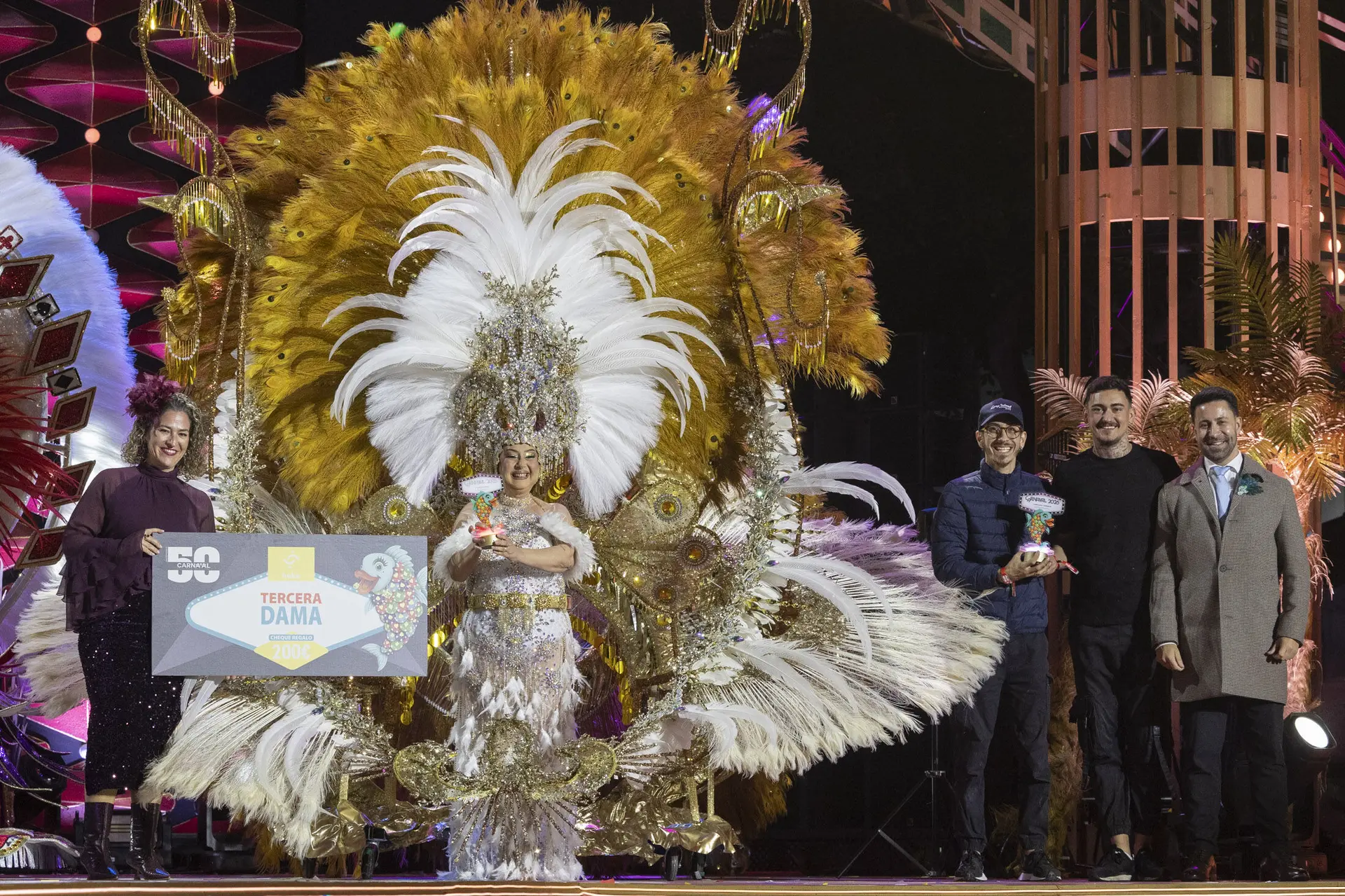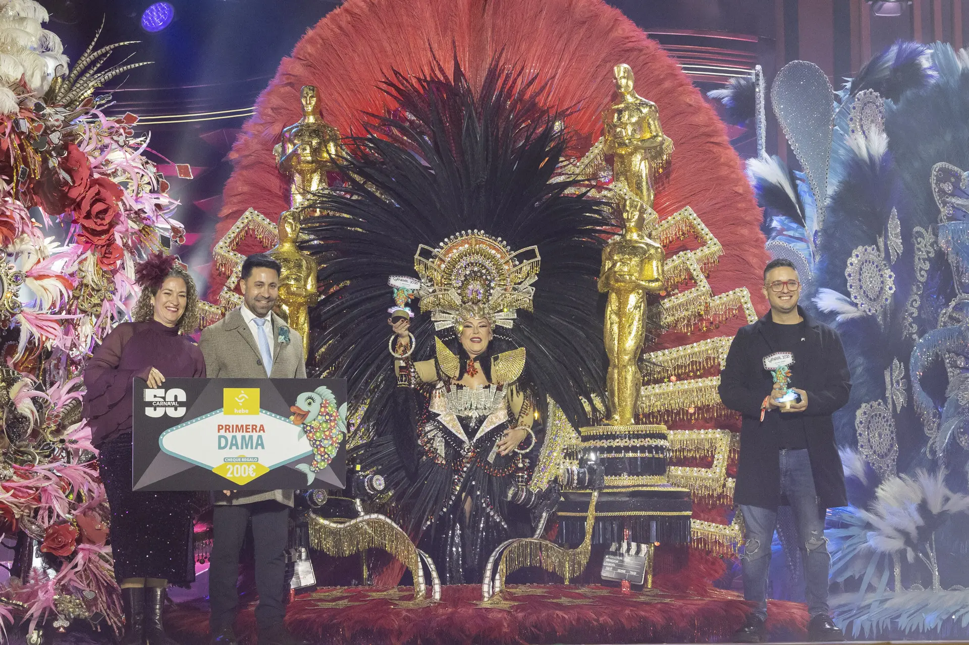 La actriz Lili Quintana, en el papel de guía, les daba la bienvenida a 50 años de Carnaval junto con los ganadores del concurso de disfraces Amanecer Rociero, los personajes del Carnaval, la afilarmónica Los Nietos de Kika y Pepe Benavente que cantó el himno del Carnaval arropado por la comparsa Aragūimé. Ellos pusieron el ritmo y el colorido al comienzo de la gala.