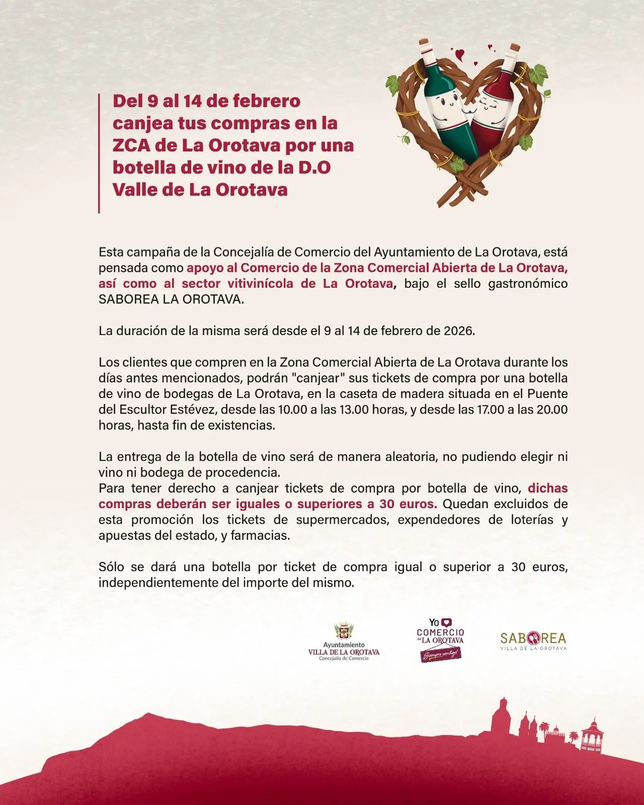 La Orotava, 6 de febrero de 2026. – El Ayuntamiento de La Orotava, a través del área de Comercio dirigida por Deisy Ramos, lanza de nuevo una campaña promocional diseñada para el Día de los Enamorados e incentivar las compras en el municipio villero a cambio de vinos de la D.O. Valle de La Orotava.
