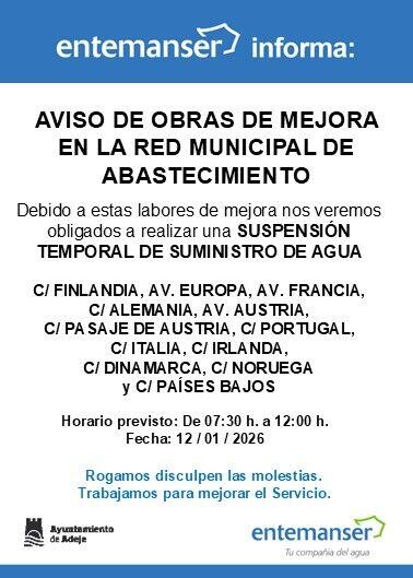 El lunes 12 de enero, Entemanser, empresa gestora del servicio municipal de agua de Adeje, llevará a cabo obras de mejora en la red municipal de abastecimiento de agua en la zona de San Eugenio. Para llevar a cabo estas obras, será necesario interrumpir el suministro de agua potable desde las 7:30 hasta las 12:30 horas. Las calles que pueden verse afectadas son: Finlandia, Avenida Europa, Avenida Francia, Alemania, Avenida Austria, Pasaje de Austria, Portugal, Italia, Irlanda, Dinamarca, Noruega y Países Bajos.