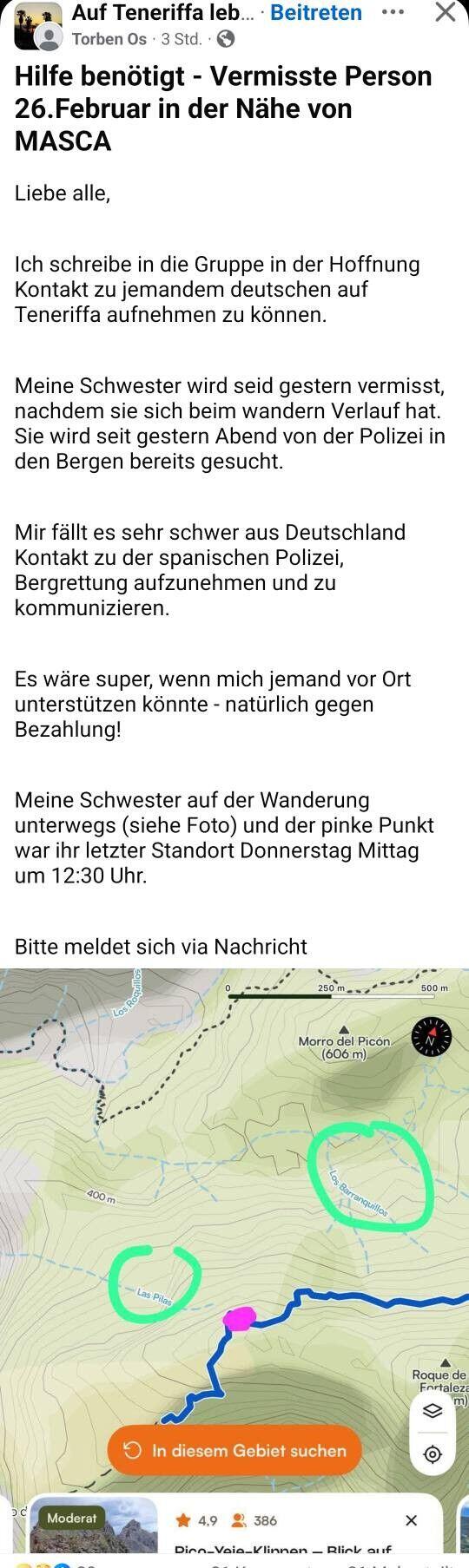 La persona ha alquilado un coche en Tenerife, en el que también pernocta. Se cree que el vehículo está aparcado cerca del Mirador de la Cruz de Hilda (TF-436). Se ha ido sola de excursión y es probable que se haya perdido. La última vez que se la vio fue el jueves cerca de Masca.